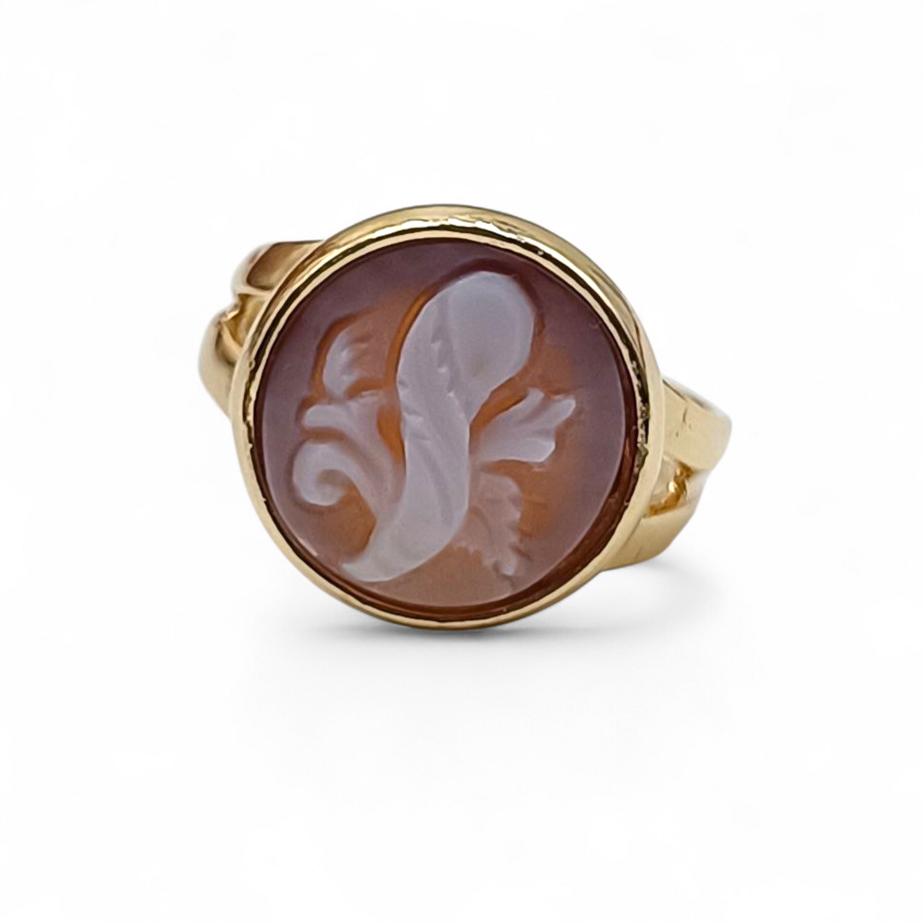 Proponiamo un anello dedicato ad uno dei Simboli Napoletani, l'Asso di Bastoni, il quale viene indicato come simbolo di autorità e forza nelle Carte Napoletane, ma viene considerato anche un porta fortuna nella Cultura Partenopea, finemente inciso a mano su Conchiglia Sardonica. Completato da una montatura in Argento 925 Dorato.