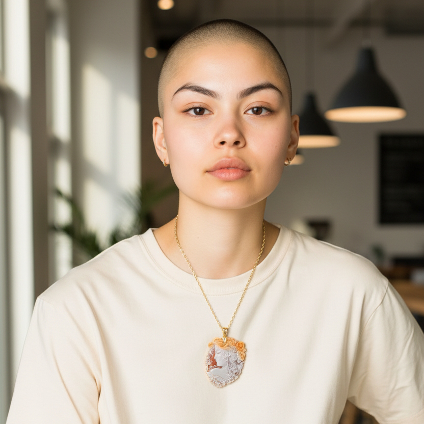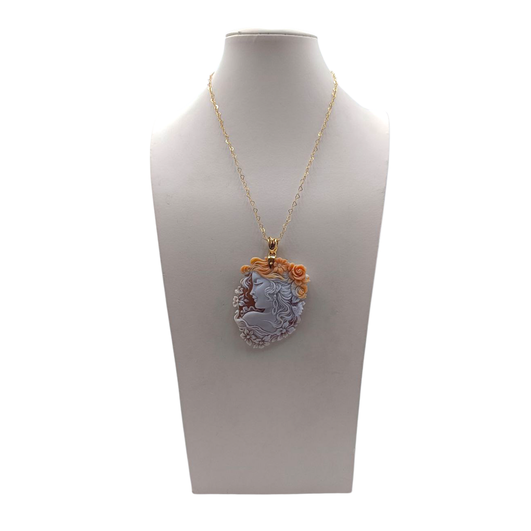 Elegante collana con un ciondolo in cammeo, con l'immagine di una Dea della Fortuna incisa finemente a mano su Conchiglia Sardonica, completato da una montatura in Argento 925 Dorato. Il ciondolo, dal fascino senza tempo, è unito con una catenina delicata che ne esalta la bellezza e la raffinatezza. Perfetta per chi ama gioielli unici che uniscono arte, storia e simbolismo. Questa collana diventa un accessorio prezioso per occasioni speciali, aggiungendo un tocco di eleganza al proprio stile, ed è adatto per ogni età.