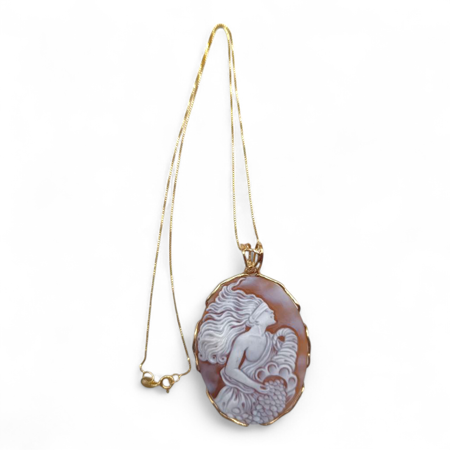 Raffinata collana con ciondolo in Conchiglia Sardonica raffigurante la Dea della Fortuna, simbolo di prosperità, protezione e buon auspicio. L'incisione ricca di dettagli, valorizza il profilo classico della divinità, e del fascino senza tempo. Il cammeo è incastonato in una montatura in Argento Dorato 925, per esaltare l'eleganza e garantire resistenza e luminosità nel tempo. Un gioiello, ideale da indossare ogni giorno o da regalare come segno di buon augurio. Perfetta per chi ama i gioielli dal gusto classico e dal forte valore simbolico.