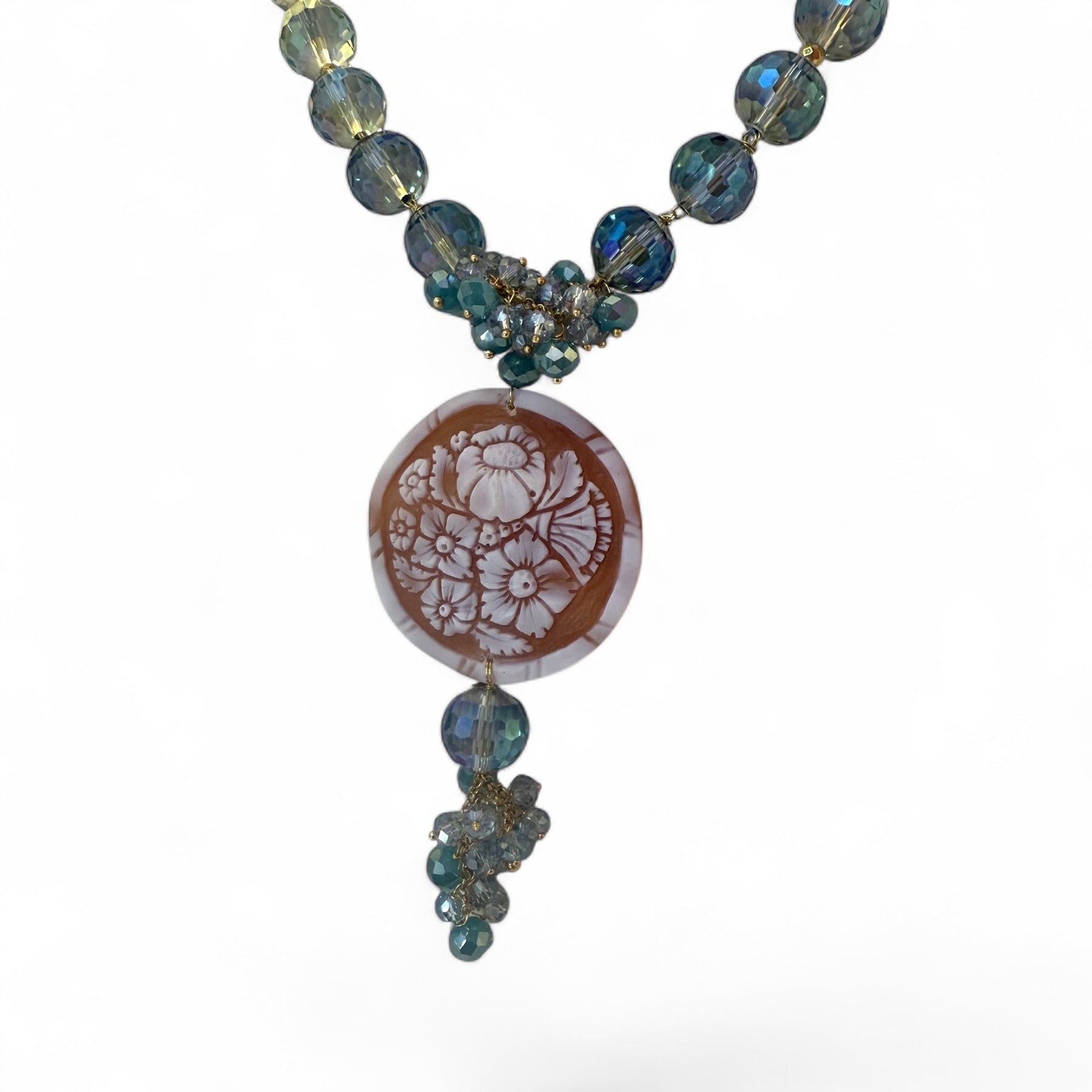 Collana fiore di Cammeo, inciso dai nostri artigiani di Torre del Greco, montati in Acciaio free nichel e cristalli azzurri.