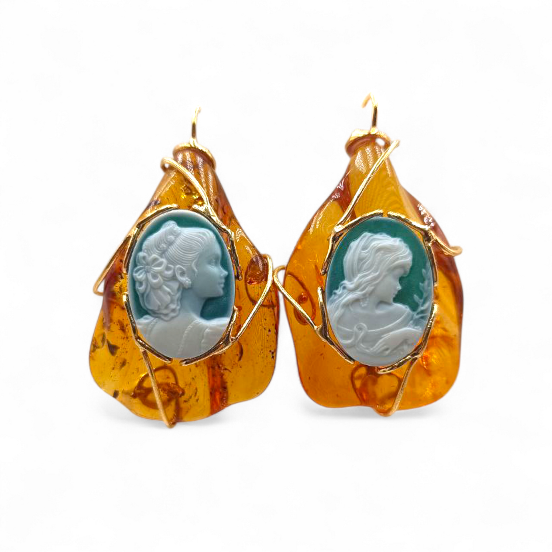 Orecchini Dea di Cammeo montati in Ambra marrone e Argento Dorato