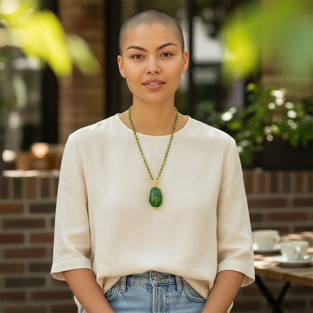 Proponiamo una splendida collana con ciondolo di forma ovale, il tutto realizzato in Ambra Verde, con montatura in Argento Dorato. Un pezzo unico, che lascia senza fiato.