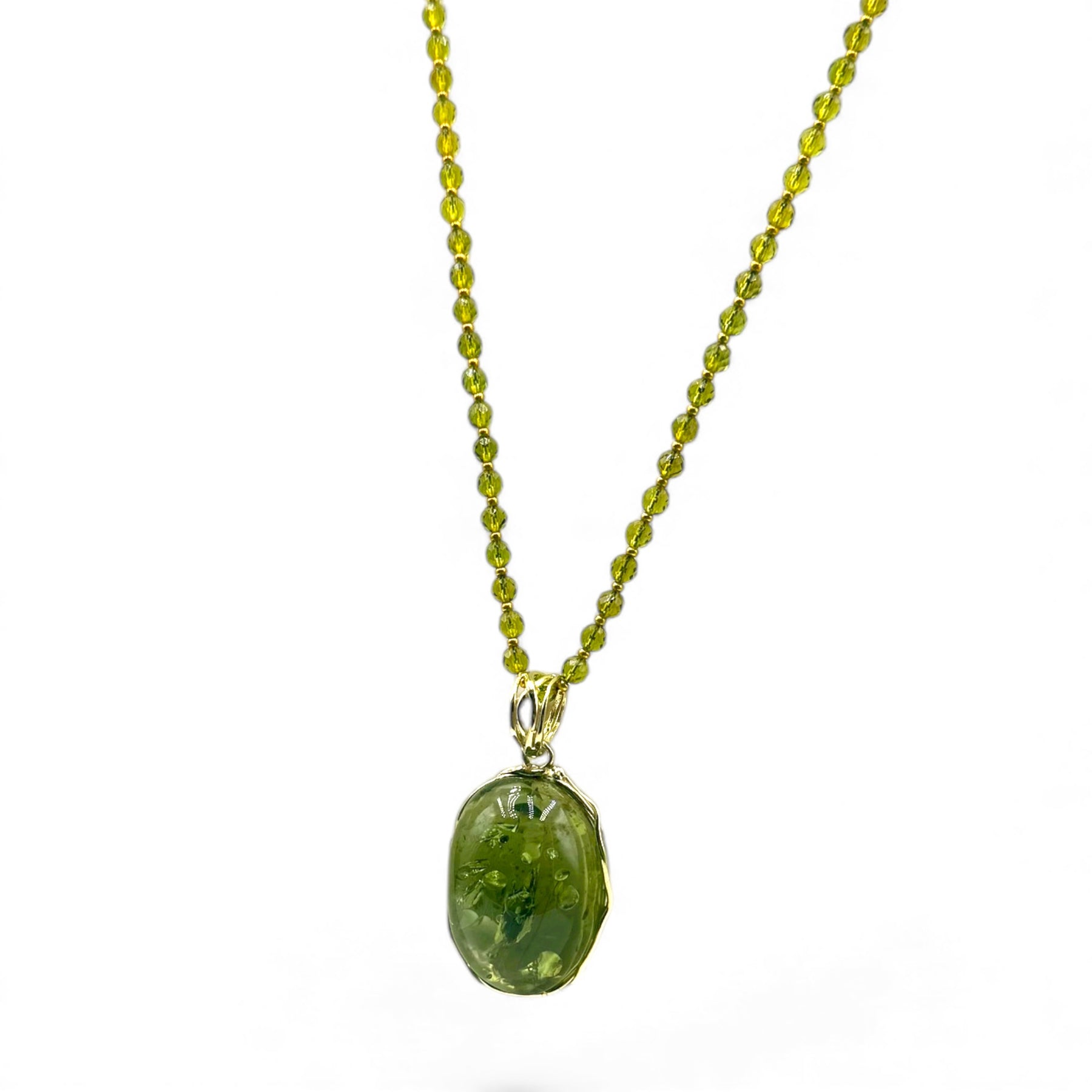 Collana con Ciondolo Ovale in Ambra Verde montato in Argento Dorato