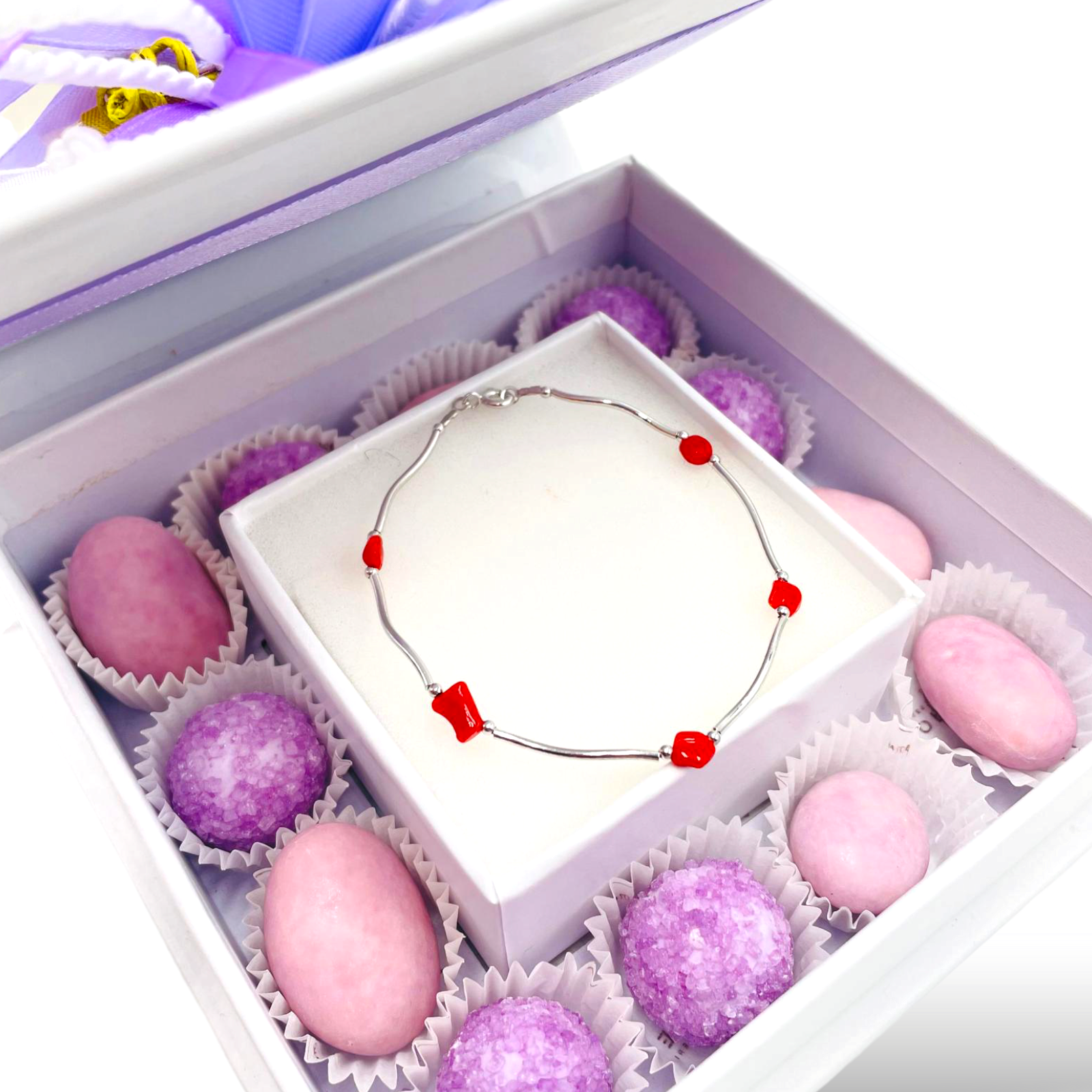 Bomboniera bracciale di corallo lavorato a mano dai maestri artigiani di Torre del Greco, montato su argento 925.